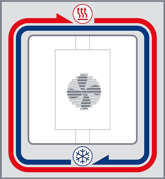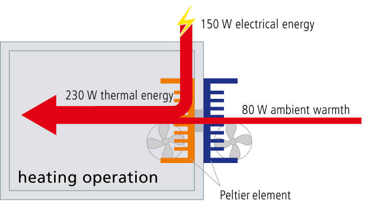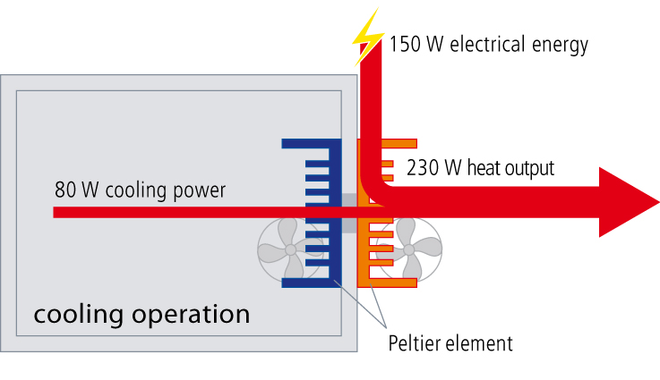 Peltier技術,制冷過程(示意圖)與加熱過程(示意圖)在一個封閉的系統中同時進行,
