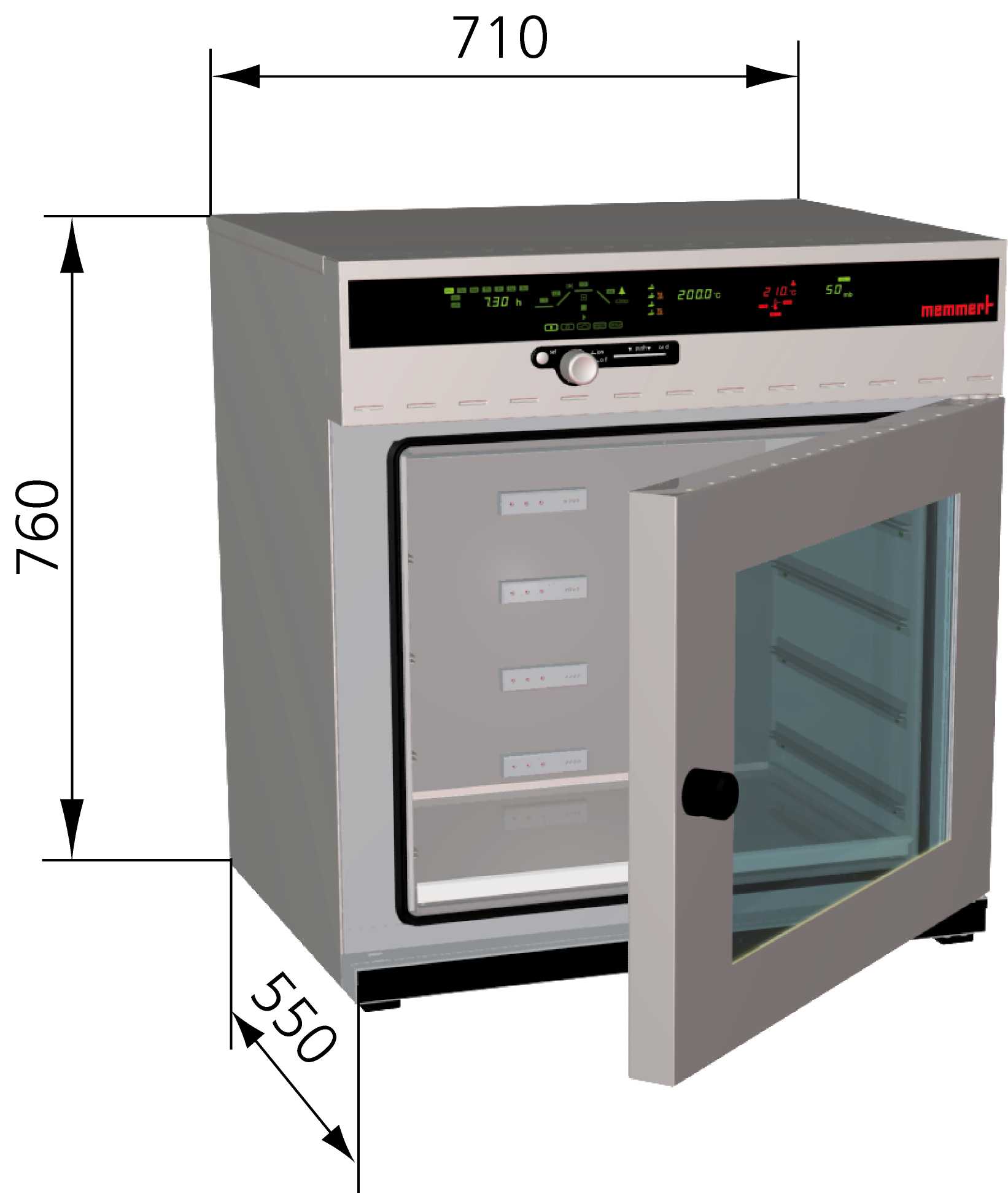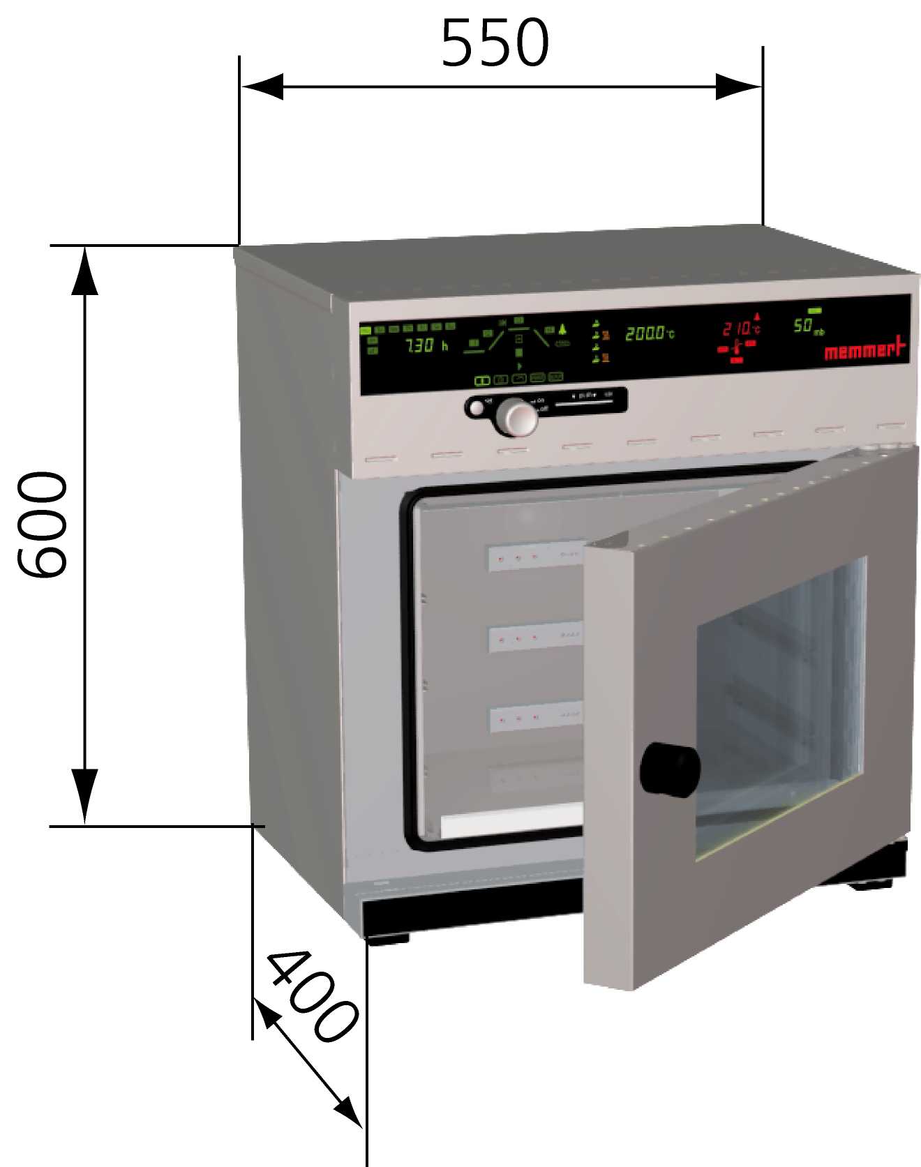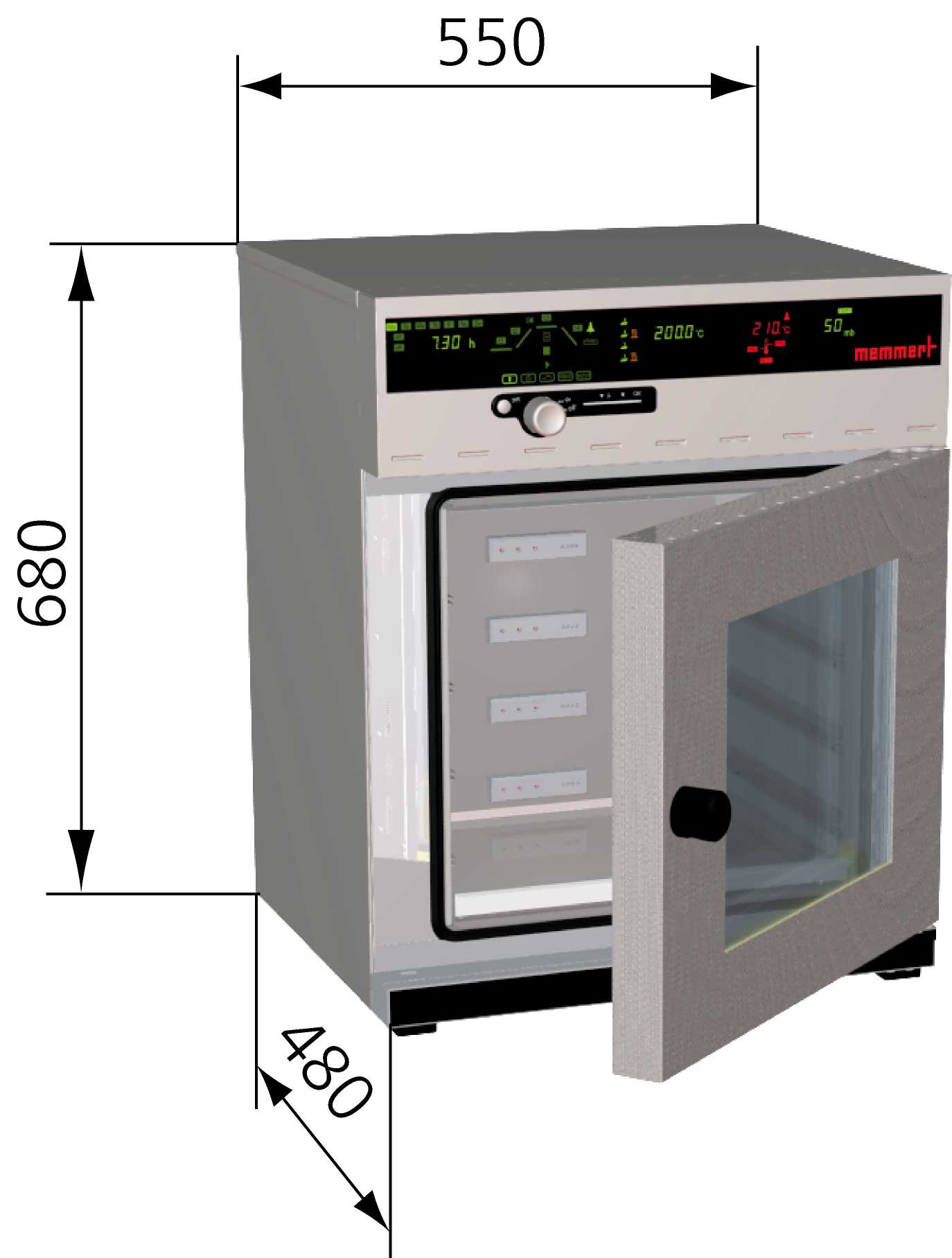 x 高h x 深d: 550 x 680 x 480 mm。內部全尺寸視窗安全玻璃門,15mm厚的高強度密封條。